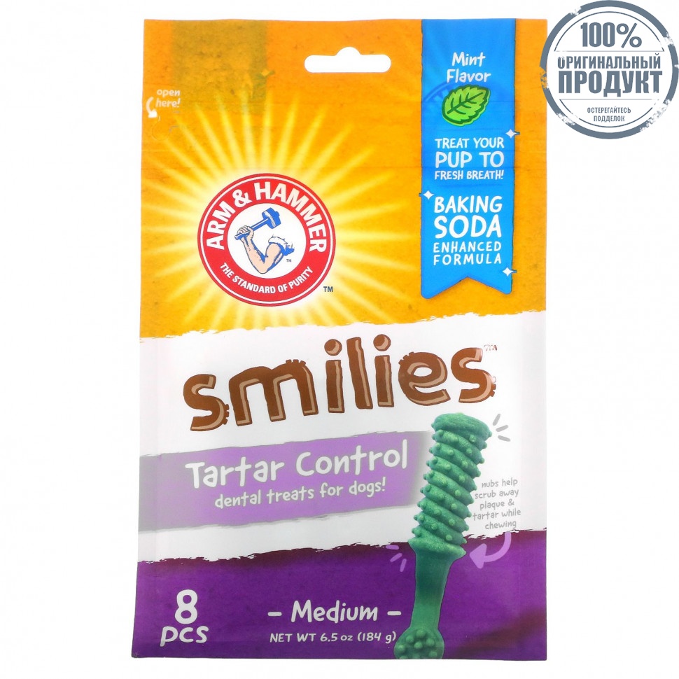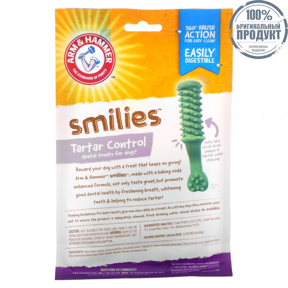 Подарите собаке лакомство, которое не перестает дарить! Arm &Hammer с добавлением пищевой соды не только обладают превосходным вкусом, но и способствуют укреплению здоровья зубов, освежая дыхание и отбеливая зубы. & помогает уменьшить зубной камень!